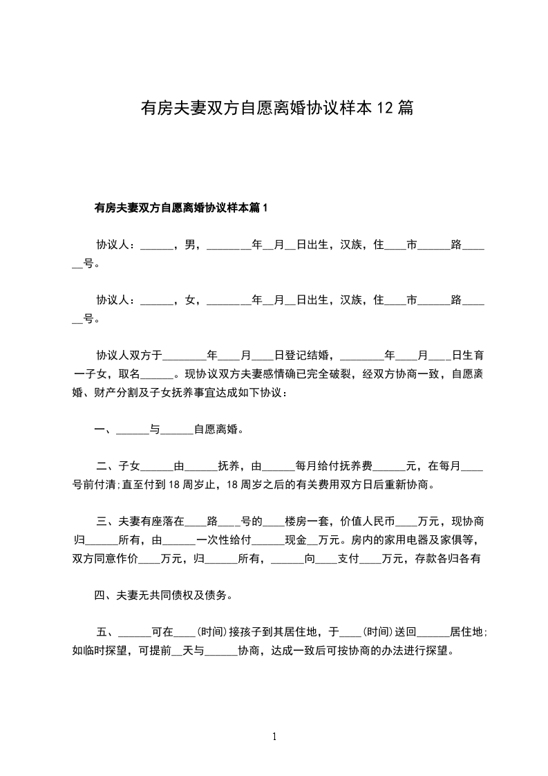(1) 夫妻婚后购有坐落在________市_____________路____________________住房一套,合同价人民币________万元(大写:___________________________),现值人民币合同价人民币________万元(大写:__________________________)。购房时以乙方主贷人贷款________万元(大写:________________________),现剩余贷款本金________万元(大写:______________________)。该房购买时首付________万元(大写:______________________)。现协商该套房产归乙方所有,由乙方一次性给付甲方现金________万元(大写:______________________),此款在本协议签订后第二天付清;