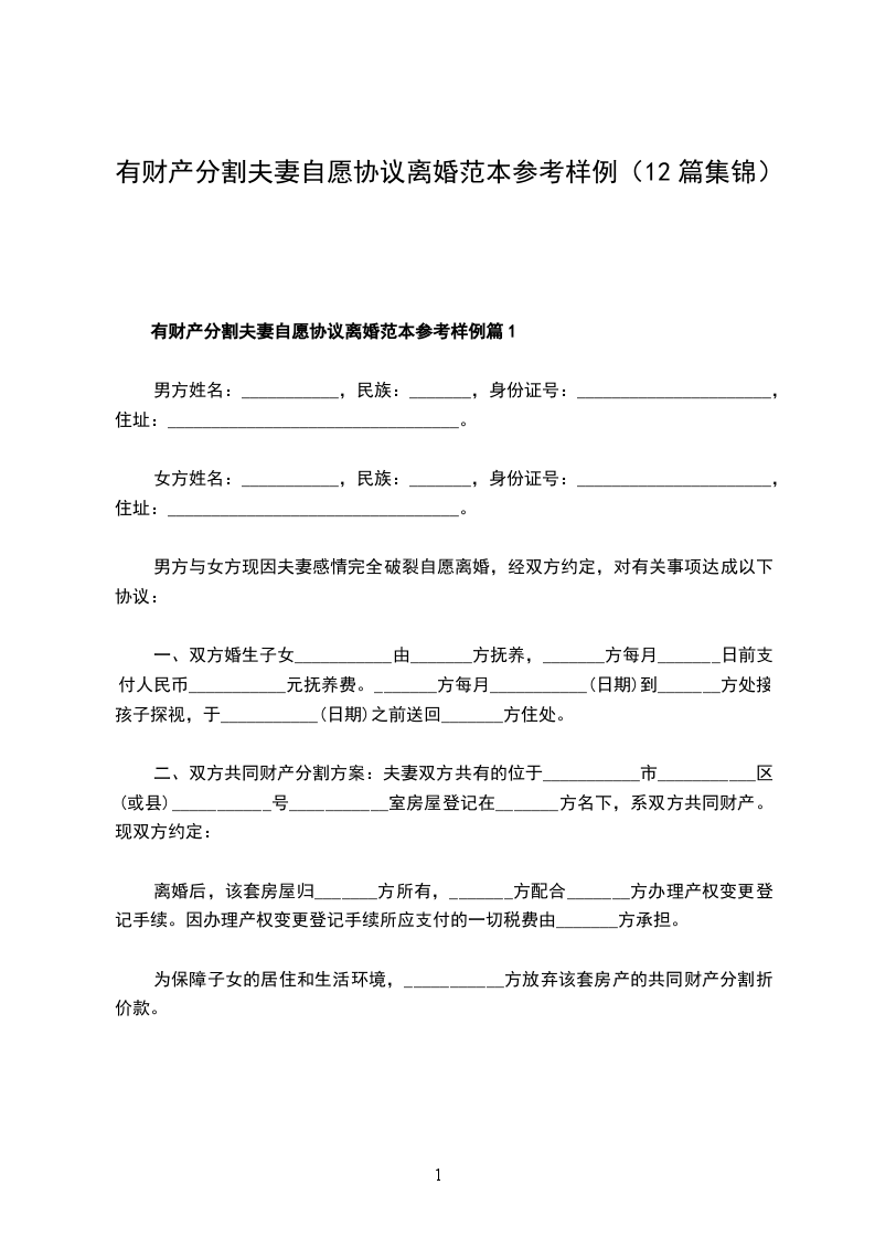有财产分割自愿离婚协议模板篇12