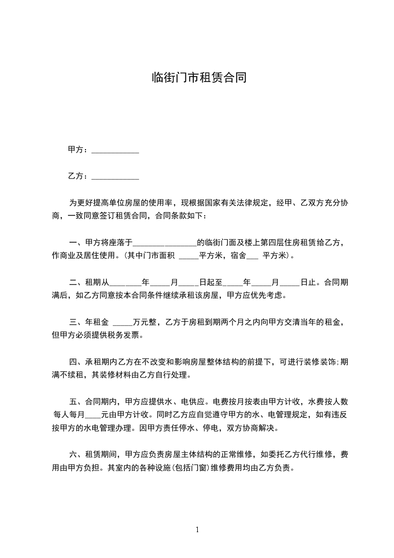 一、甲方将座落于________________的临街门面及楼上第四层住房租赁给乙方,作商业及居住使用。(其中门市面积 _____平方米,宿舍___ 平方米)。