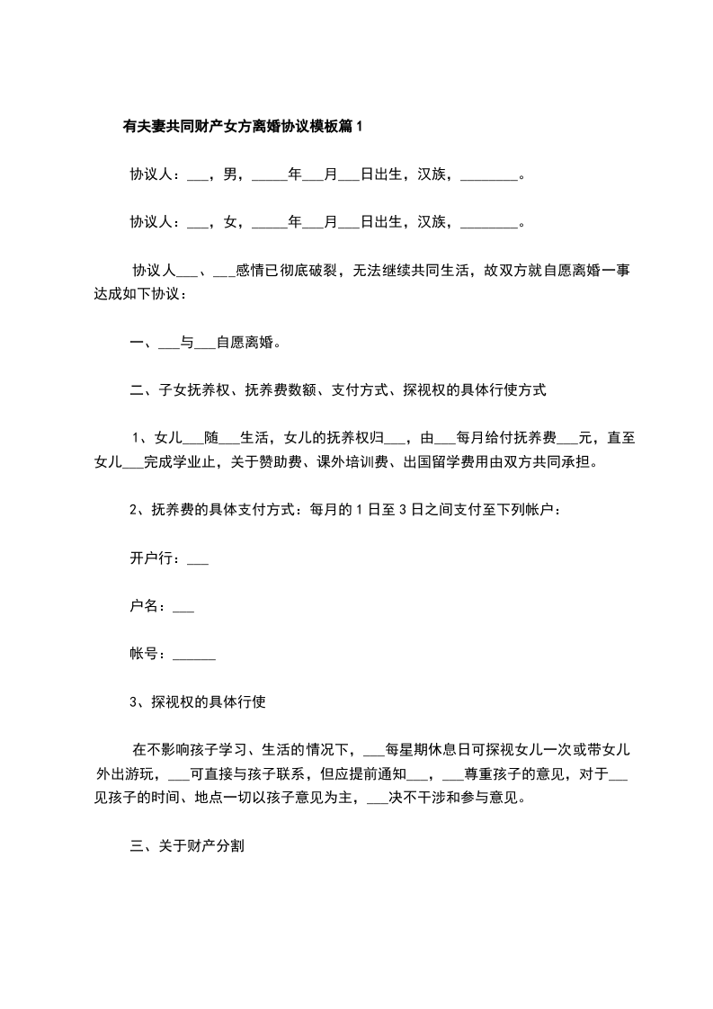 (/男方每月可探望女儿一次或带女儿外出游玩,但应提前通知女方,女方应保证男方每月探望的时间不少于一天。)