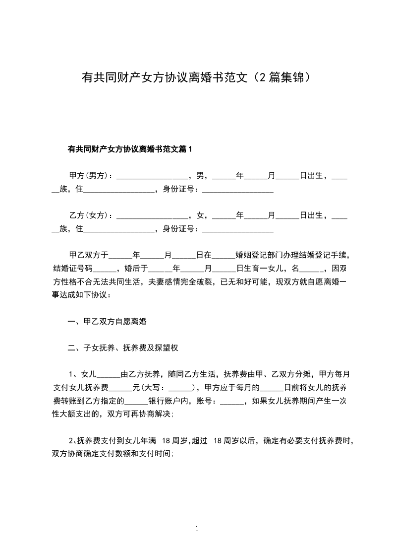 女方:某某,女,汉族,_年_月_日生,住____________,身份证号码:_______________