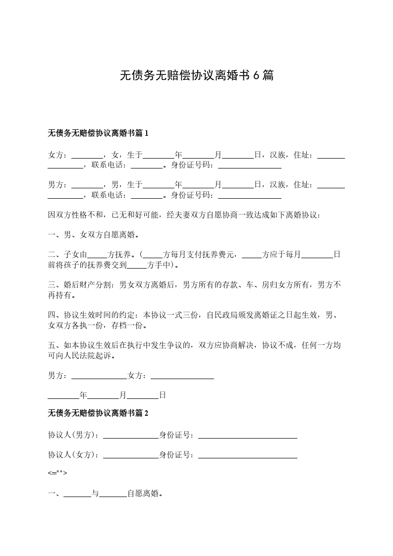 八、本协议一式三份,男、女双方各执一份,婚姻登记机关存档一份,自婚姻登记机颁发《离婚证》之日起生效。九、如本协议生效后在执行中发生争议的,双方应协商解决,协商不成,任何一方均可向相关人民法院起诉。