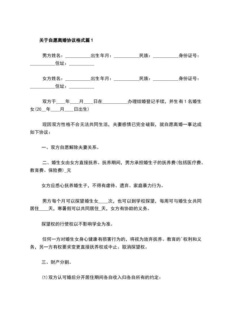 协议人:____,女,____年____月____日出生,____族,住____市____路____号。