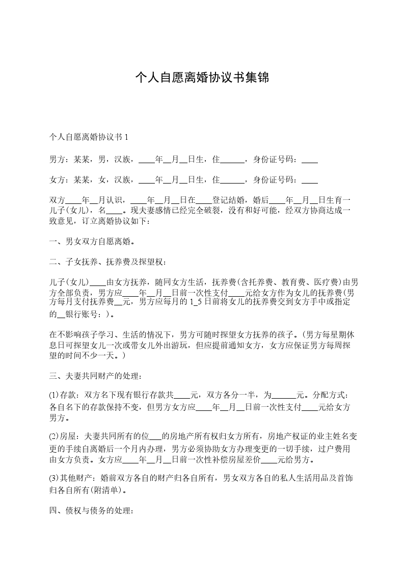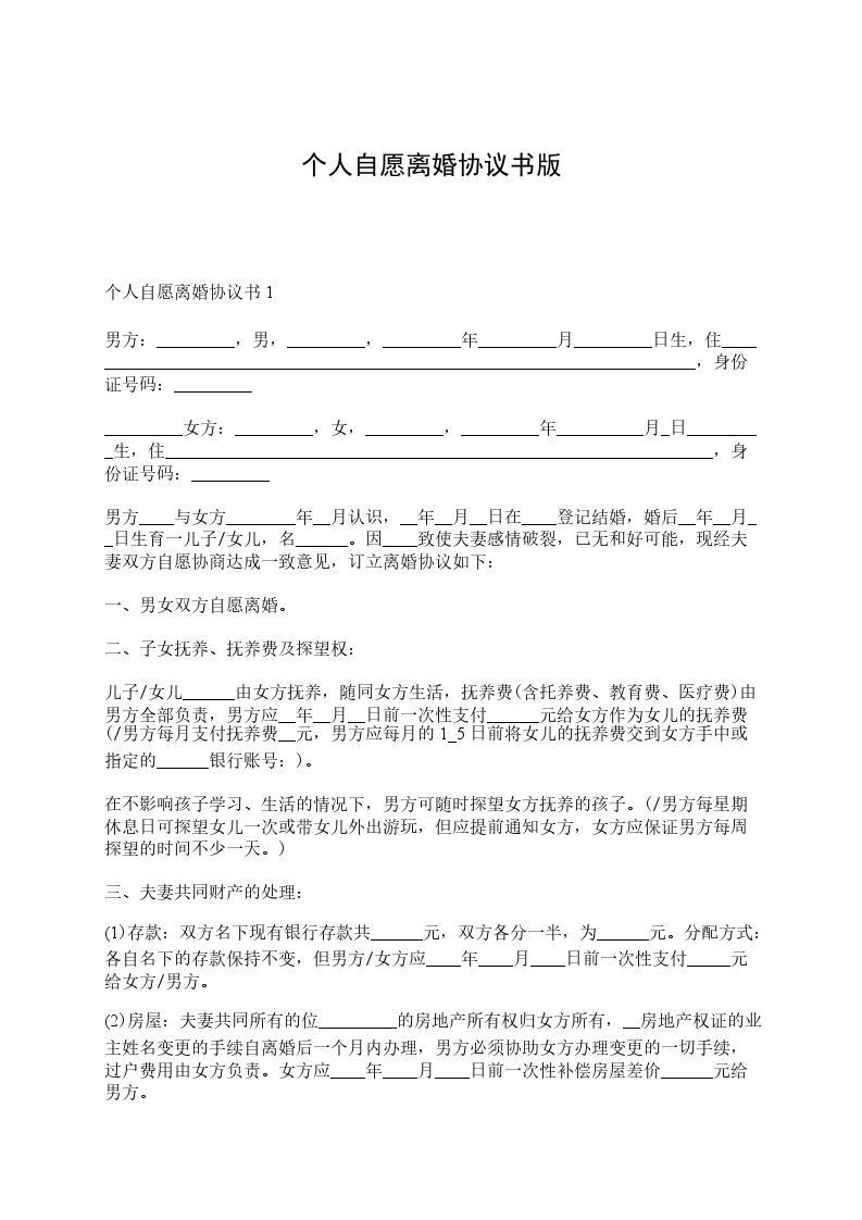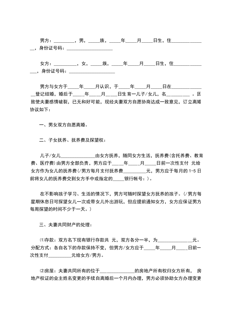 男方与女方于_____年_____月认识,于_____年_____月_____日在_______________登记结婚,婚后于_____年_____月_____日生育一儿子/女儿,名__________ 。因 致使夫妻感情破裂,已无和好可能,现经夫妻双方自愿协商达成一致意见,订立离婚协议如下: