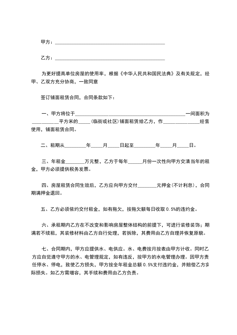 签订铺面租赁合同,合同条款如下: