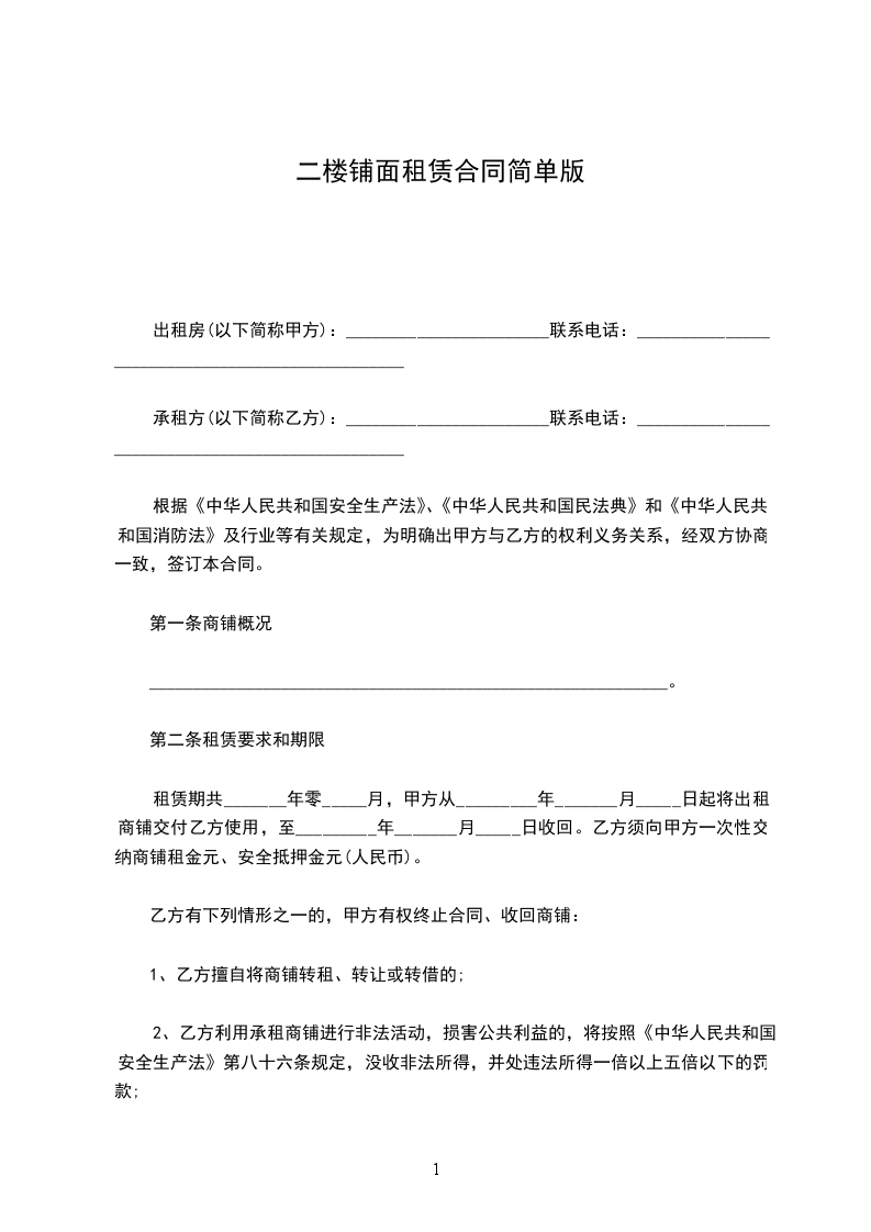 一、甲方将位于______________________________________________一间面积为___________平方米的_____(临街或社区)铺面租赁给乙方,作_______________经营使用,铺面租赁合同。