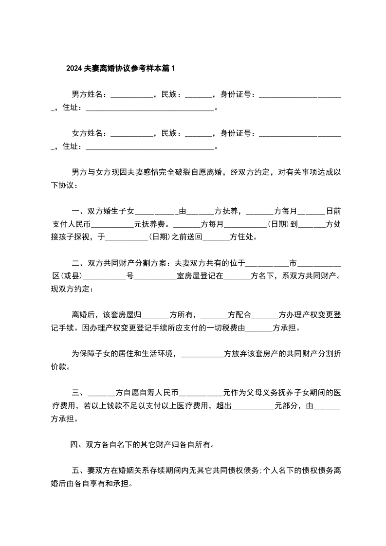 2024夫妻离婚协议参考样本篇1
