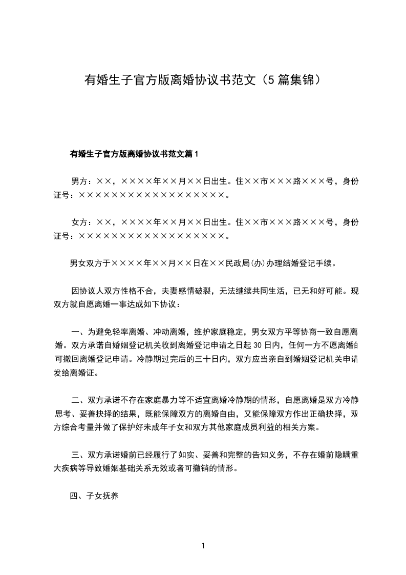 有婚生子官方版离婚协议书范文篇1