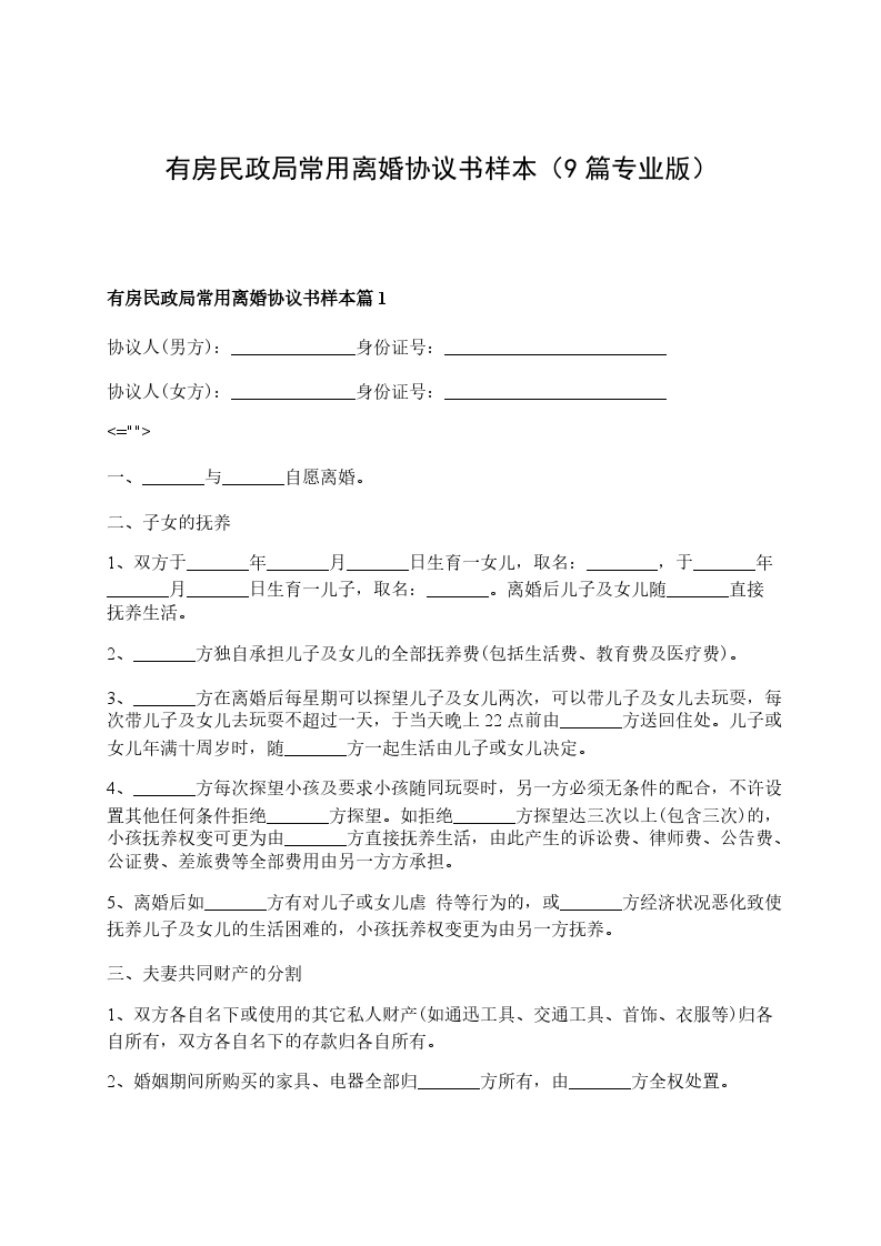 有房民政局常用离婚协议书样本篇9