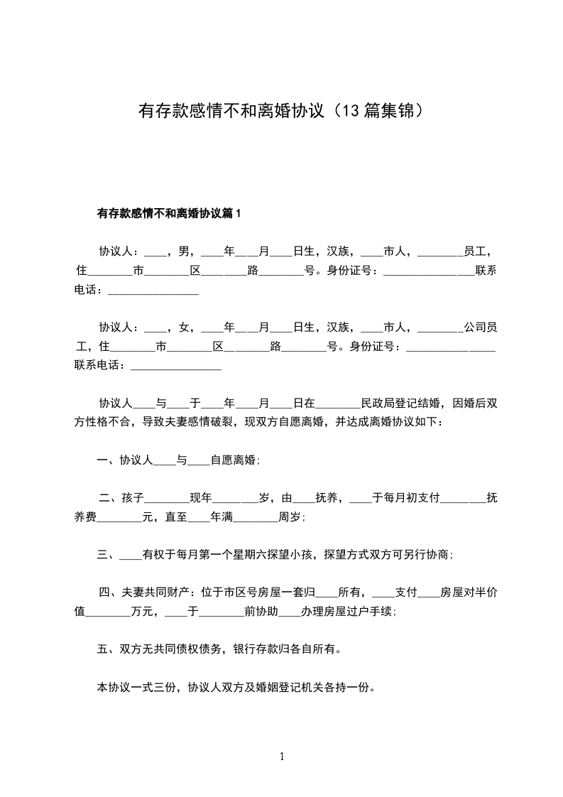 1、【存款】双方婚姻关系存续以来,目前共有存款××××元,目前男方账户××××元,女方账户××××元,双方同意,男方/女方在本协议签订之日起3日内给男方/女方××××元。
