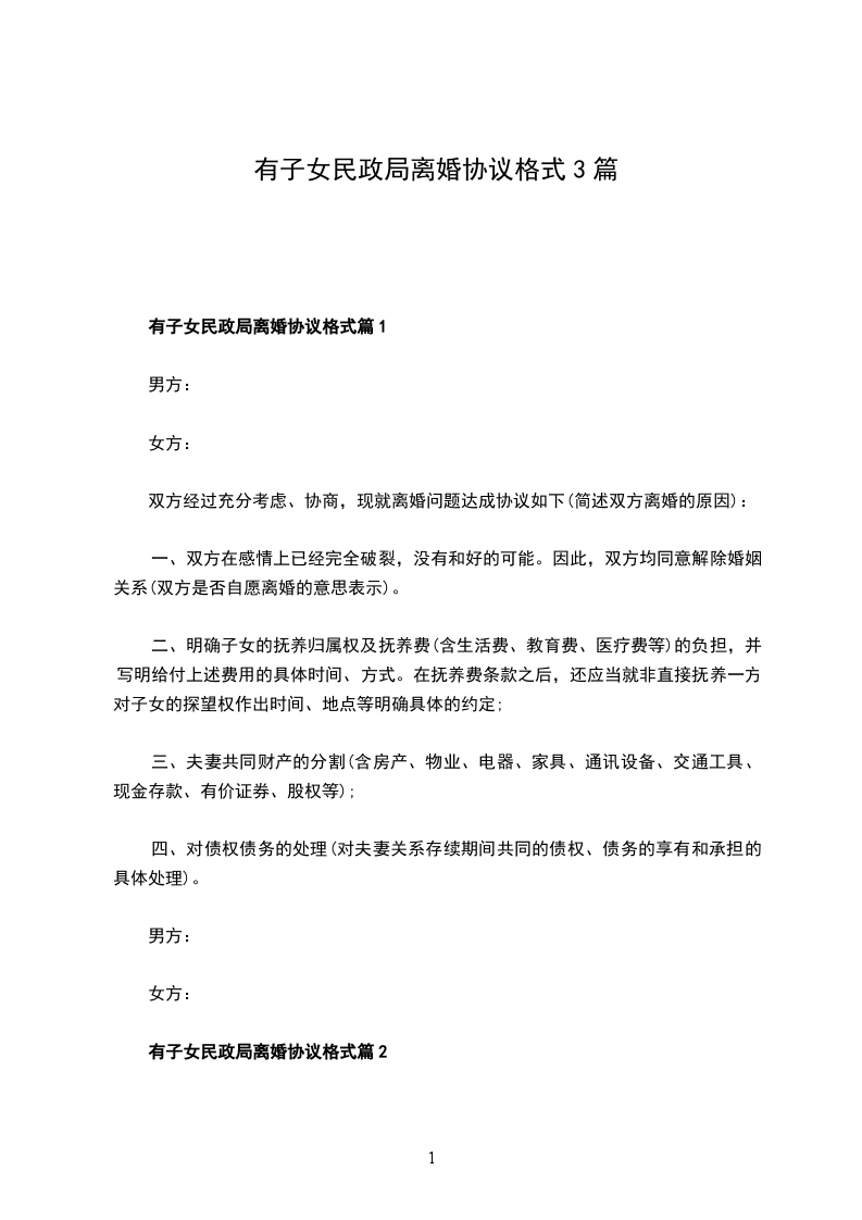 2、本协议一式三份,男女双方各执一份,婚姻登记机关存档一份。