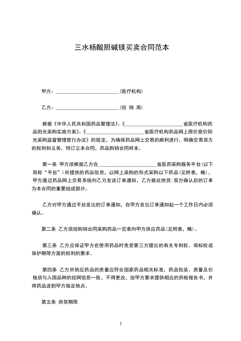根据《中华人民共和国药品管理法》、《________________________省医疗机构药品阳光采购实施方案》、《________________________省医疗机构药品网上限价竞价阳光采购监督管理暂行办法》的规定,为确保药品网上交易的顺利进行,明确交易双方的权利和义务,特订立本合同,药品购销合同样本。