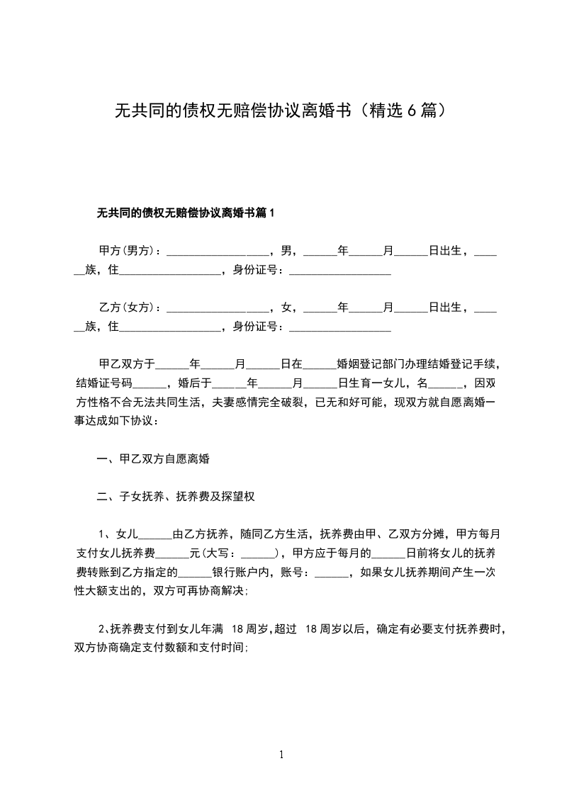 无共同的债权无赔偿协议离婚书篇6