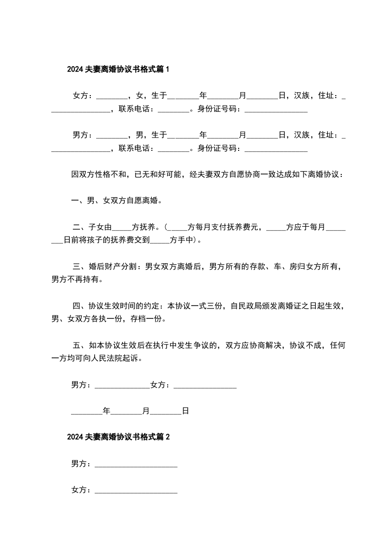 2024夫妻离婚协议书格式篇1