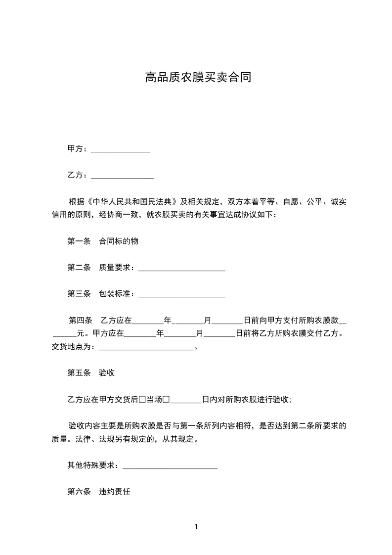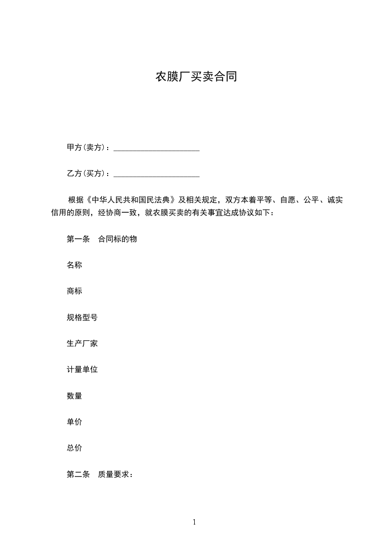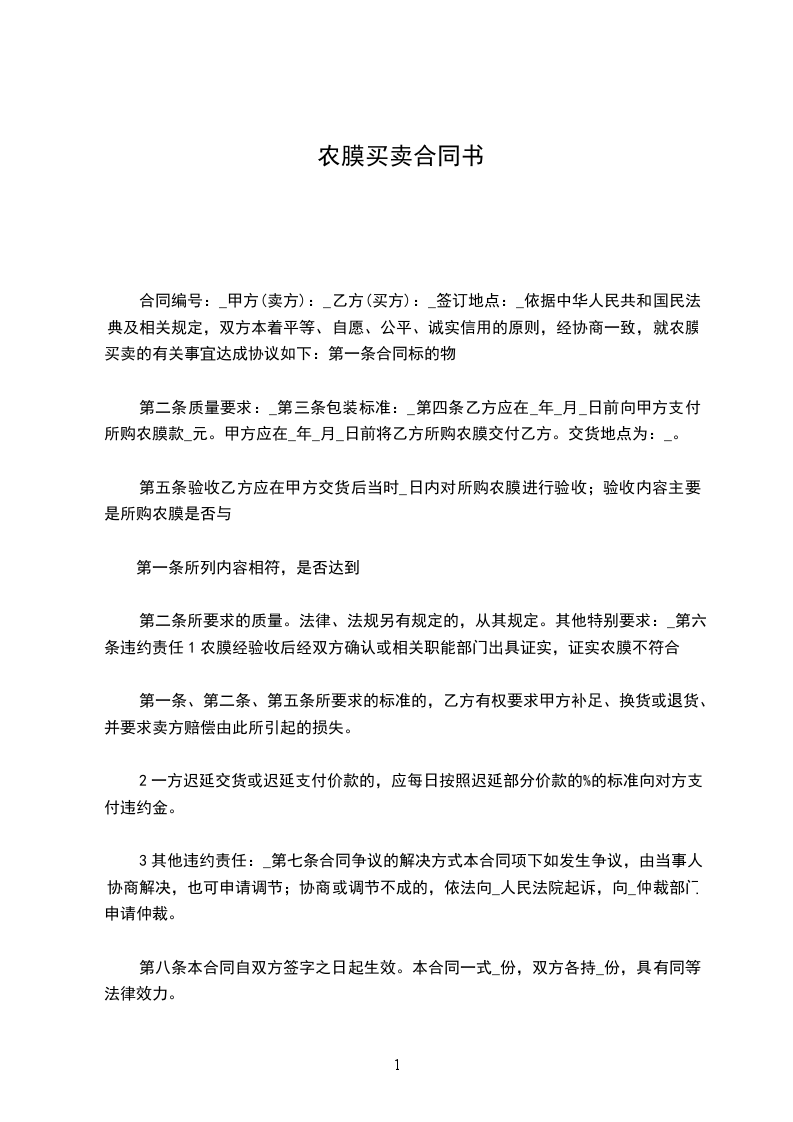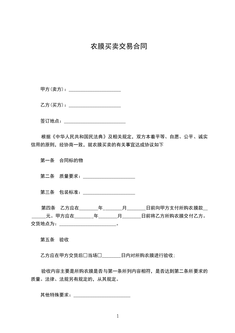 根据《中华人民共和国民法典》及相关规定,双方本着平等、自愿、公平、诚实信用的原则,经协商一致,就农膜买卖的有关事宜达成协议如下: