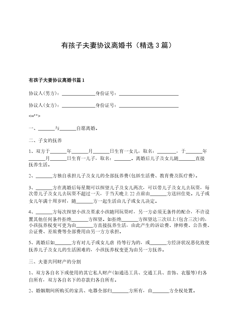 本协议一式三份,一份二张,男、女双方各执一份,婚姻登记机关存档一份,自婚姻登记机颁发《离婚证》之日起生效。