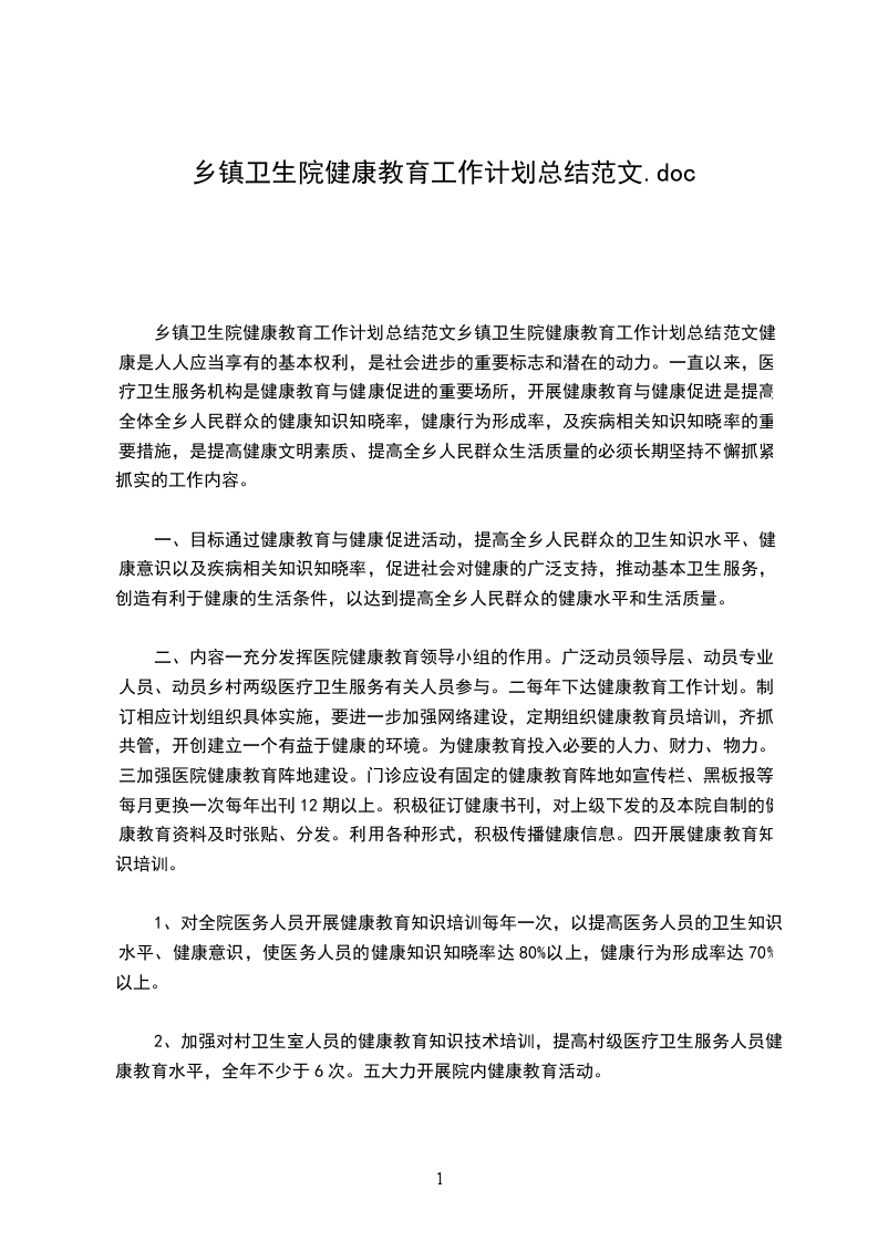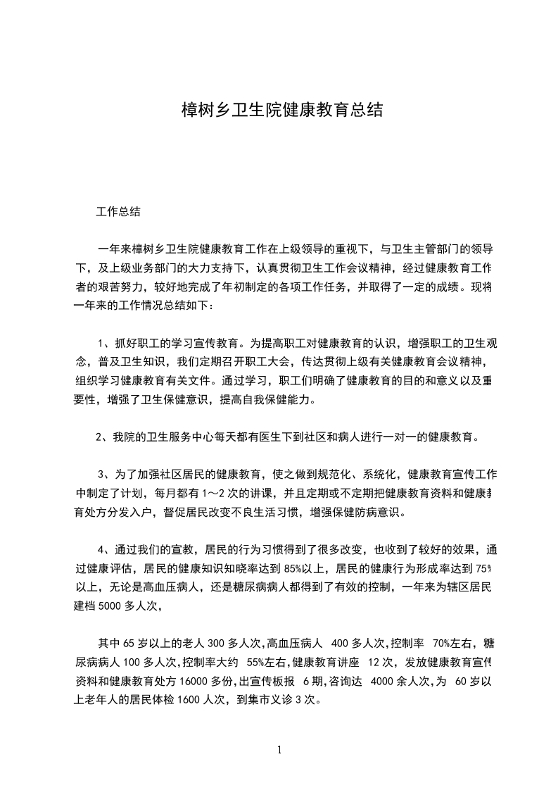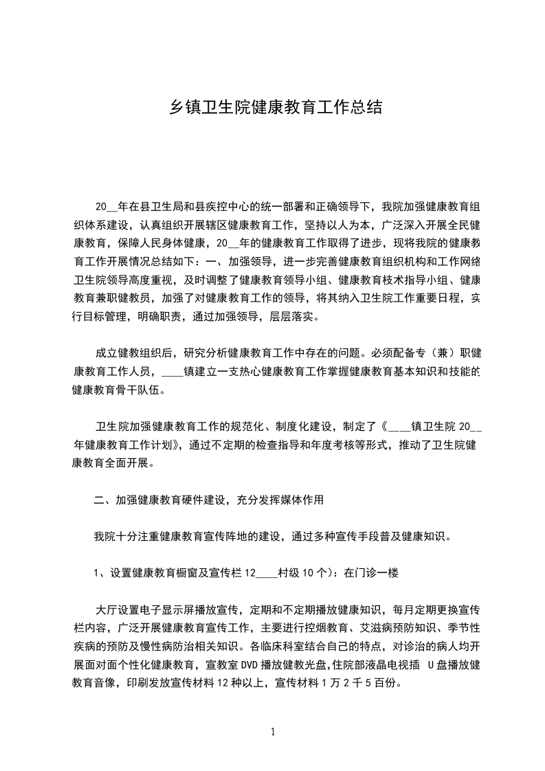 20__年在县卫生局和县疾控中心的统一部署和正确领导下,我院加强健康教育组织体系建设,认真组织开展辖区健康教育工作,坚持以人为本,广泛深入开展全民健康教育,保障人民身体健康,20__年的健康教育工作取得了进步,现将我院的健康教育工作开展情况总结如下:一、加强领导,进一步完善健康教育组织机构和工作网络卫生院领导高度重视,及时调整了健康教育领导小组、健康教育枝术指导小组、健康教育兼职健教员,加强了对健康教育工作的领导,将其纳入卫生院工作重要日程,实行目标管理,明确职责,通过加强领导,层层落实。