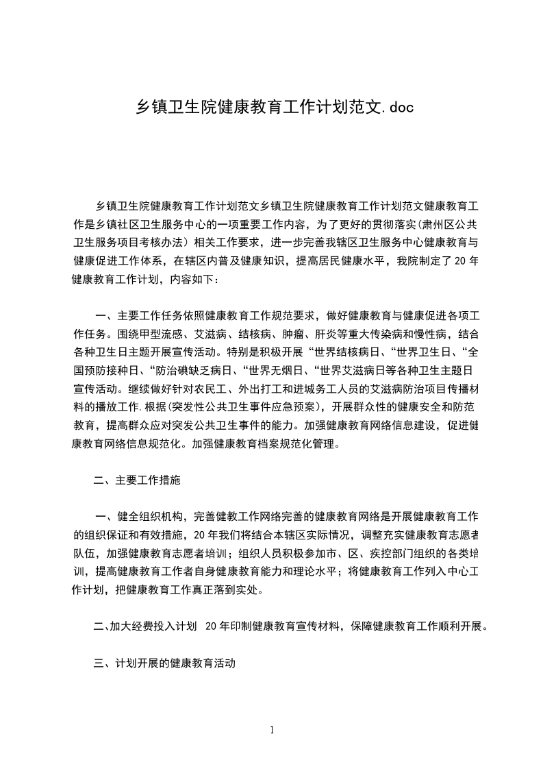 卫生院加强健康教育工作的规范化、制度化建设,制定了《____镇卫生院20__年健康教育工作计划》,通过不定期的检查指导和年度考核等形式,推动了卫生院健康教育全面开展。