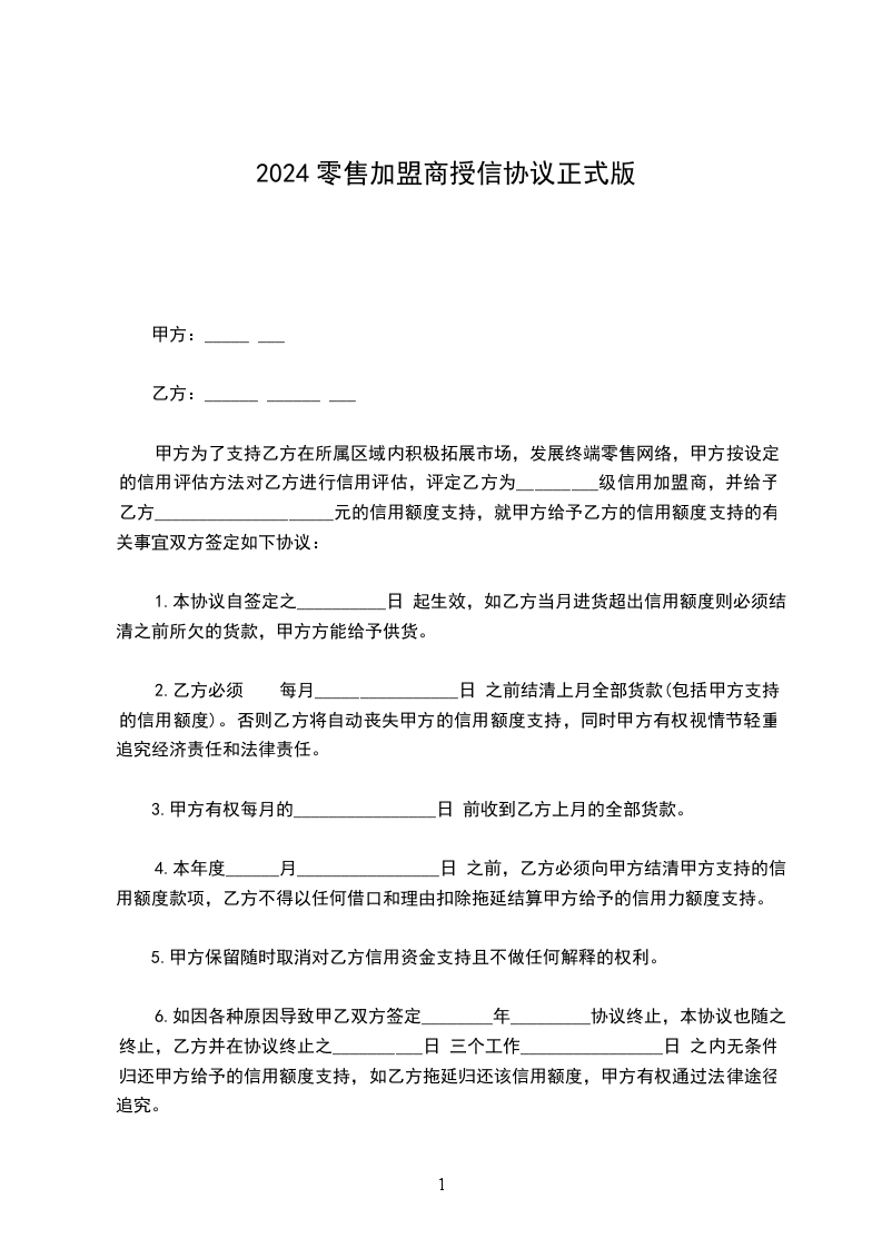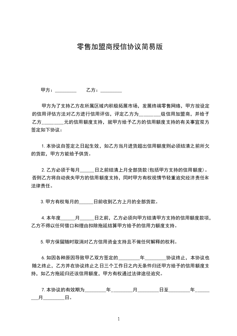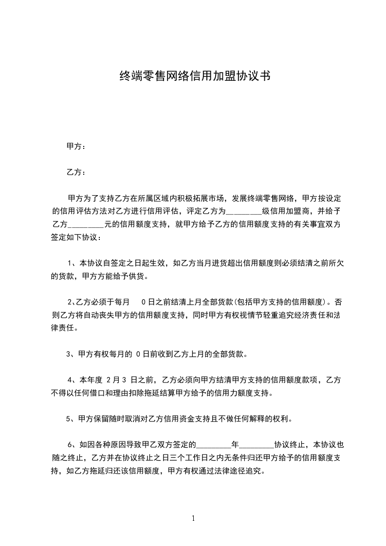 甲方为了支持乙方在所属区域内积极拓展市场,发展终端零售网络,甲方按设定的信用评估方法对乙方进行信用评估,评定乙方为_________级信用加盟商,并给予乙方_________元的信用额度支持,就甲方给予乙方的信用额度支持的有关事宜双方签定如下协议: