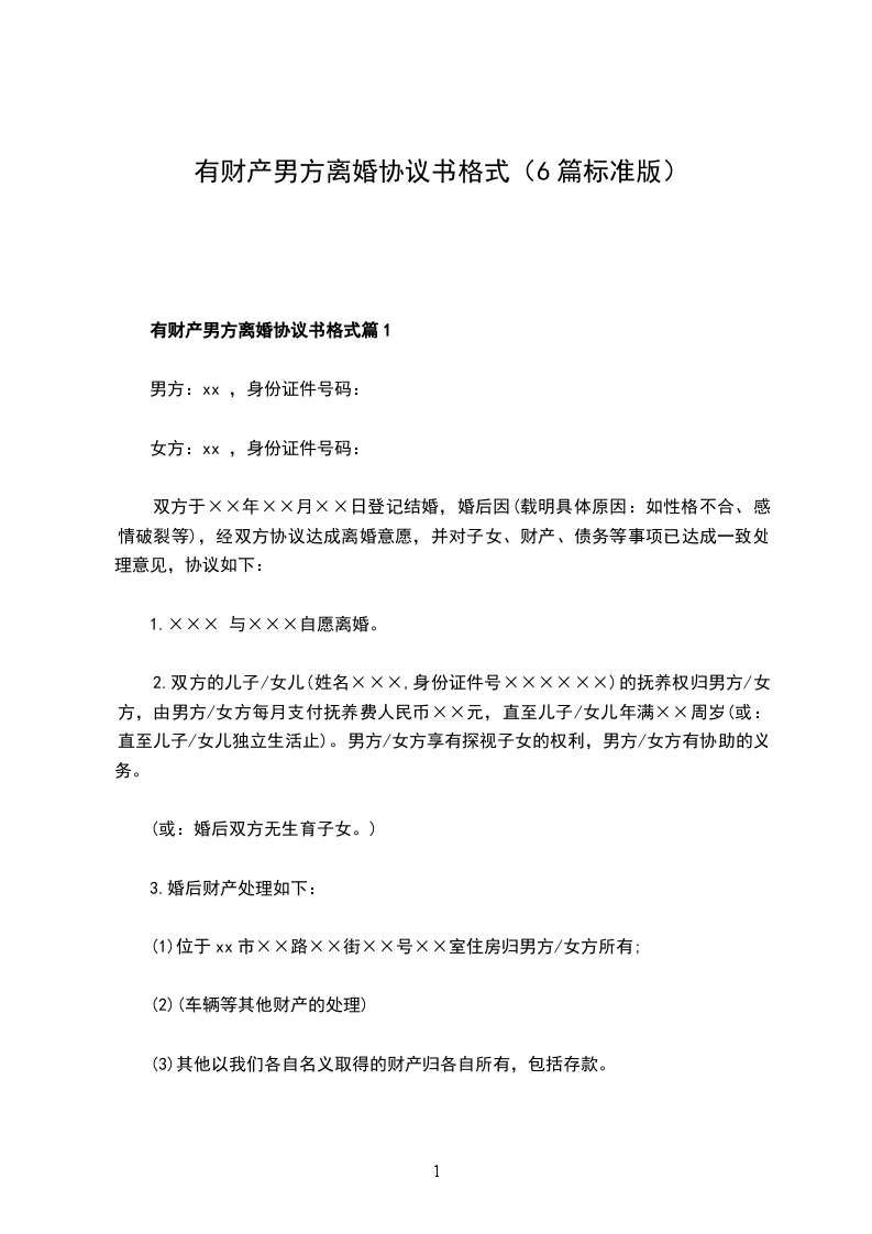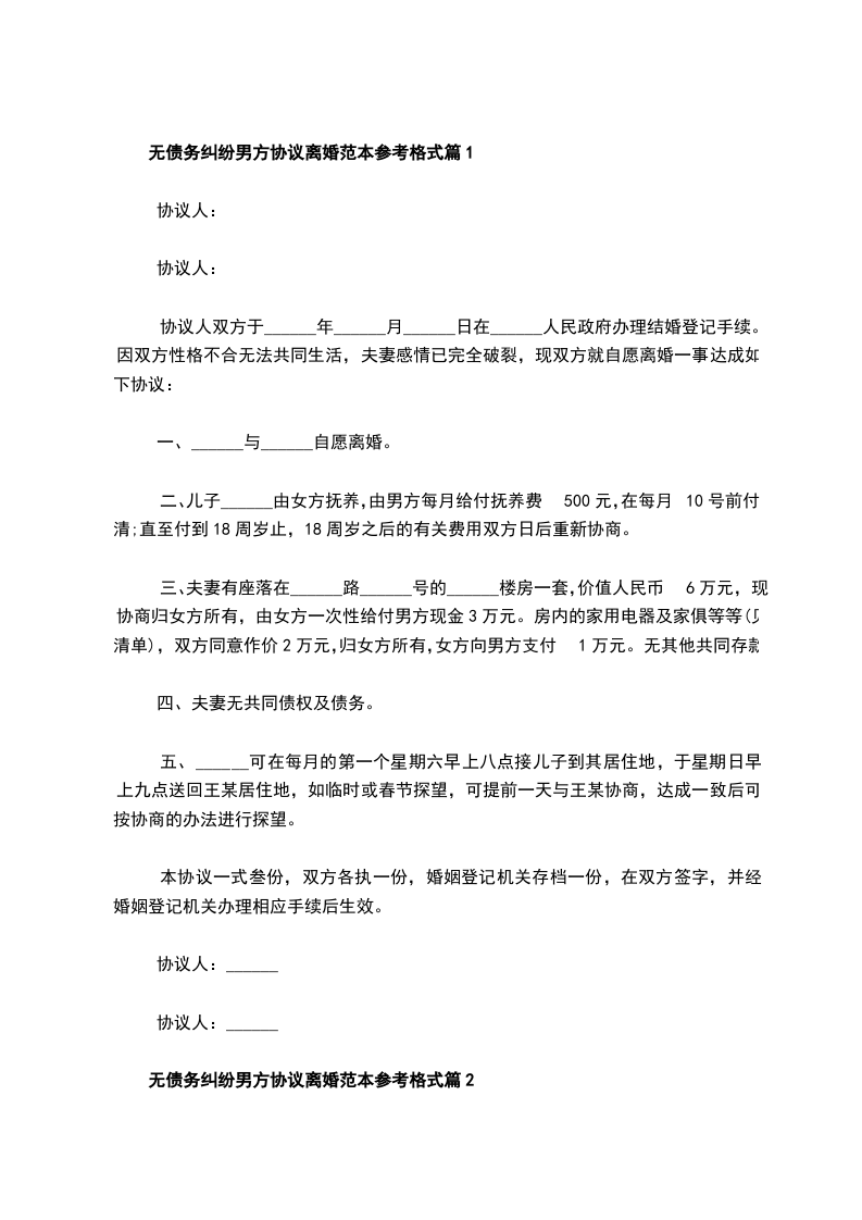 新男方离婚协议参考格式篇6