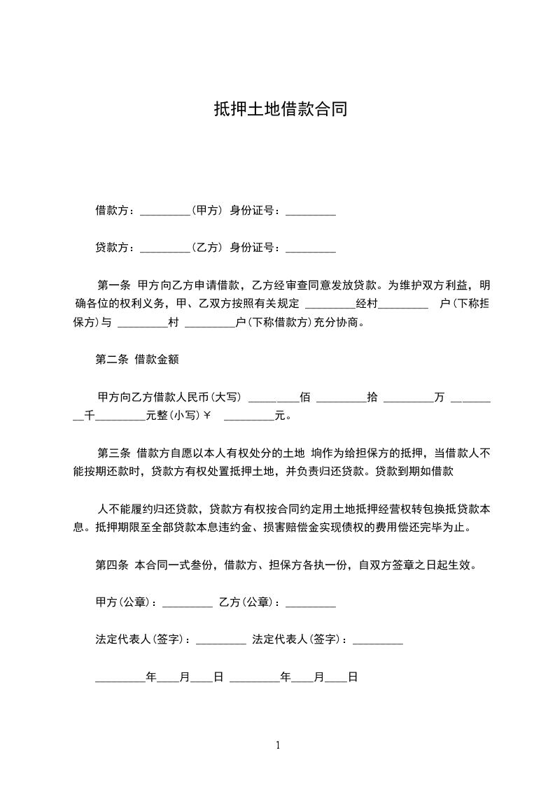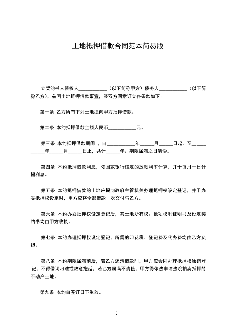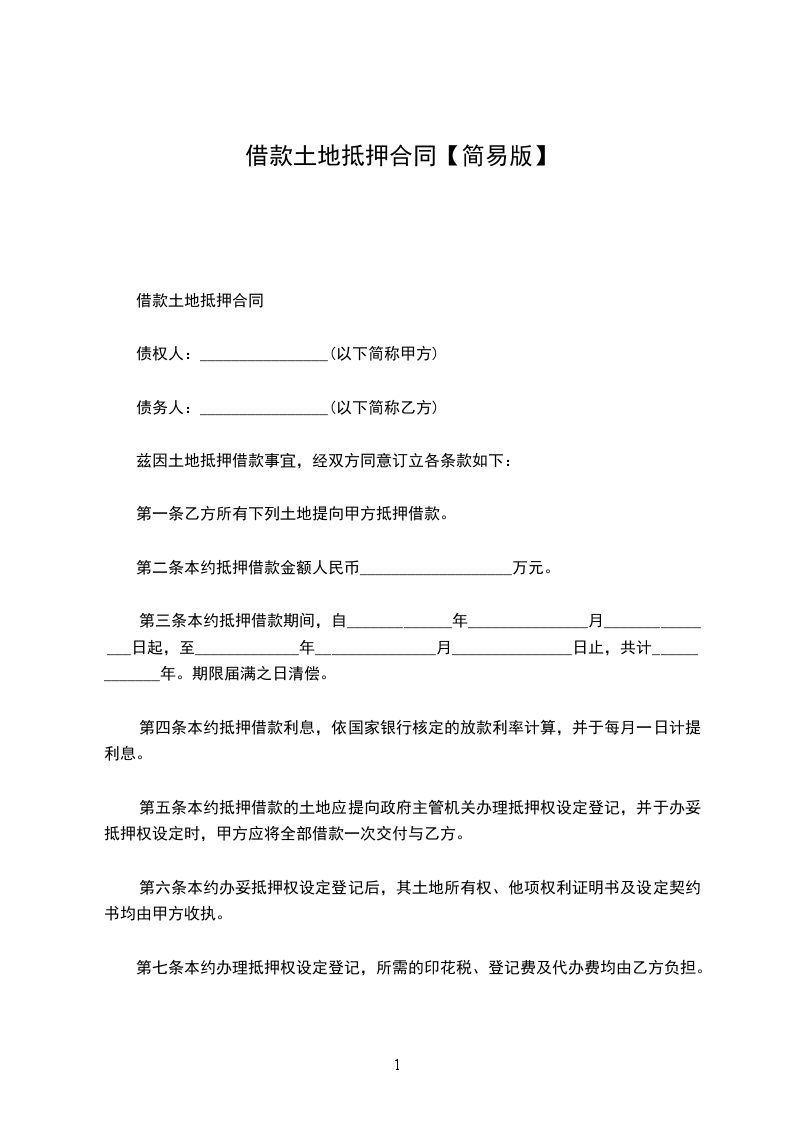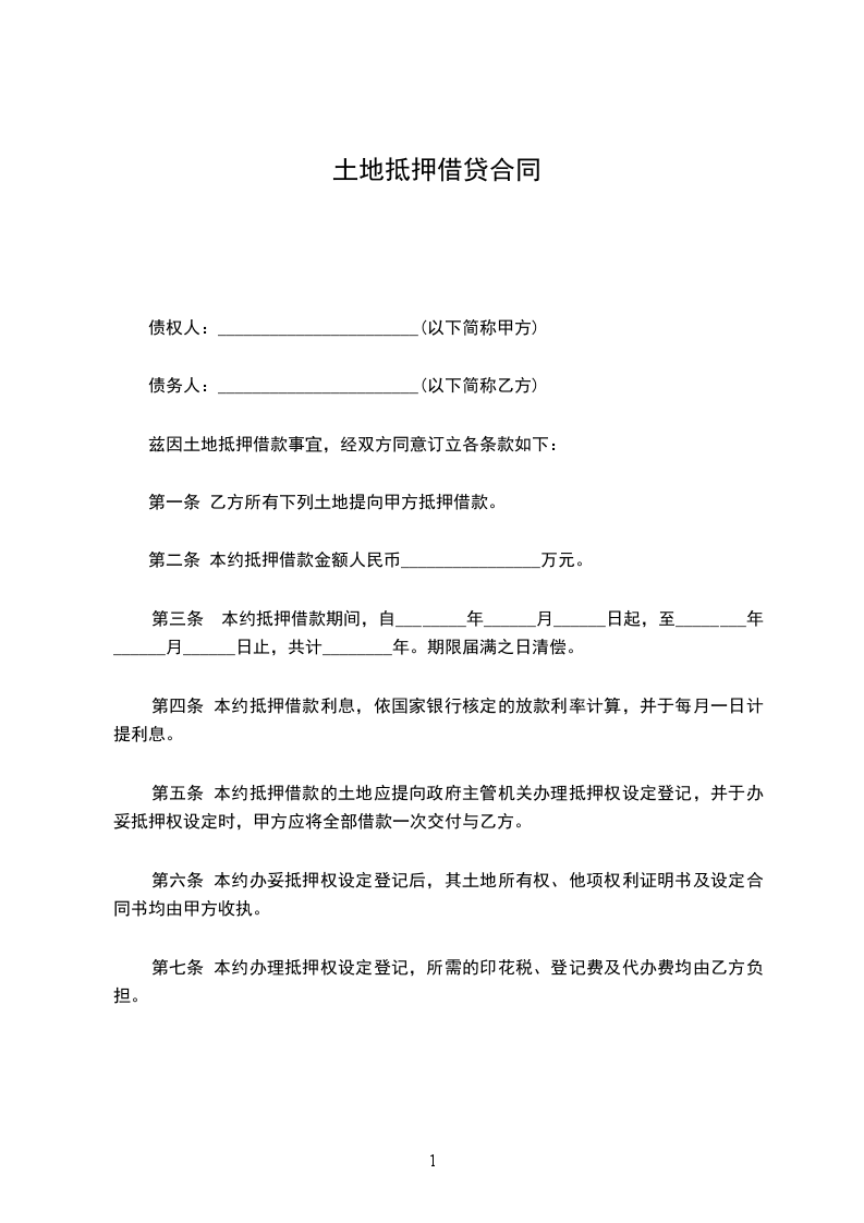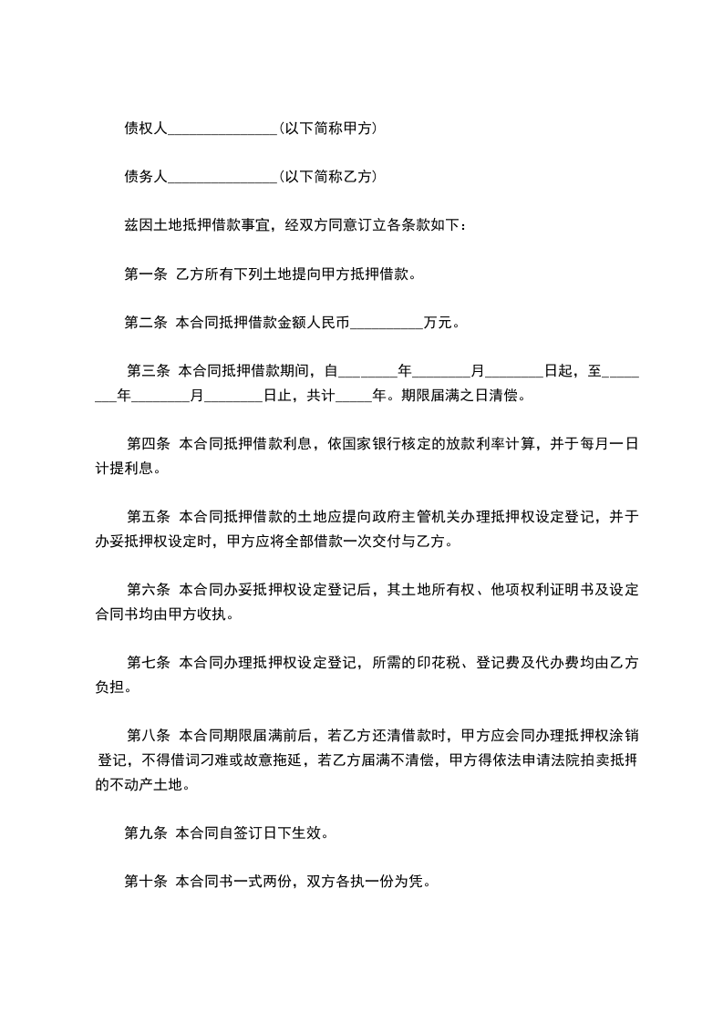 立契约书人债权人____________(以下简称甲方)债务人____________(以下简称乙方),兹因土地抵押借款事宜,经双方同意订立各条款如下:
