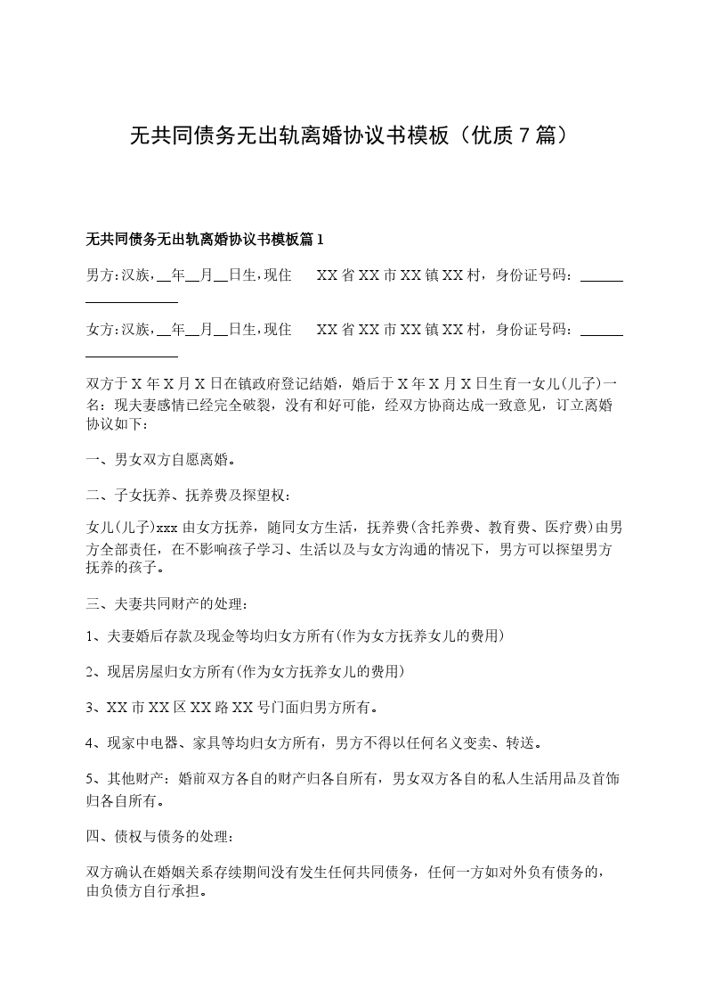 四、双方婚姻关系存续期间无共同债权、债务纠纷。今后若发现,谁经手谁负责,若因男方/女方对外借款导致男方/女方承担责任的,可向对方全额追偿。