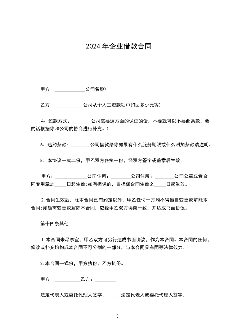 第一条 本合同规定____ 年贷款额为人民币(大写)____ 万元,用于____ 。