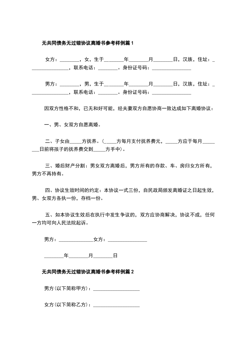 无共同债务无过错协议离婚书篇9
