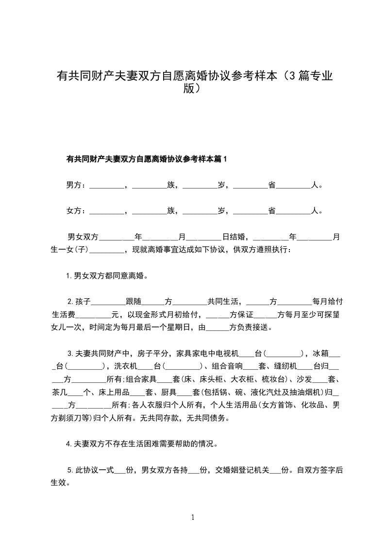 一、__________与__________自愿离婚。