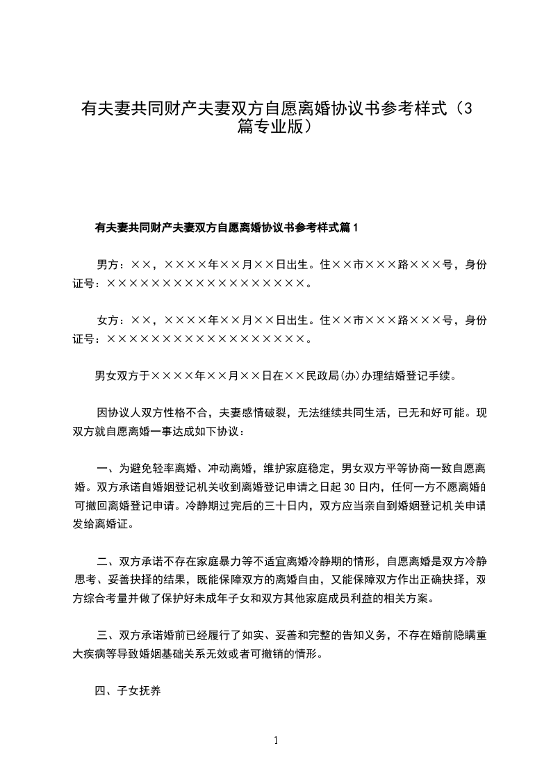 7.本协议一式三份,男女双方各持一份,婚姻登记机关存档一份。