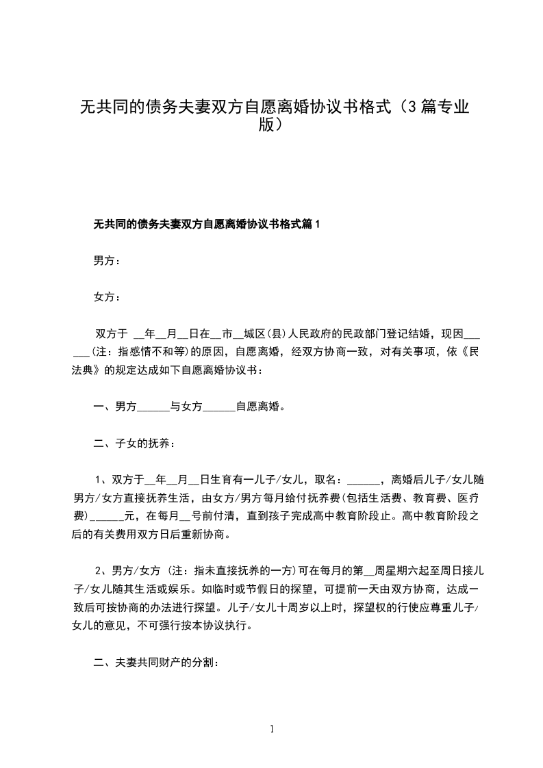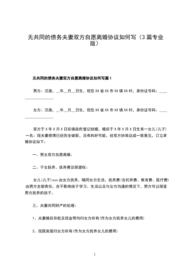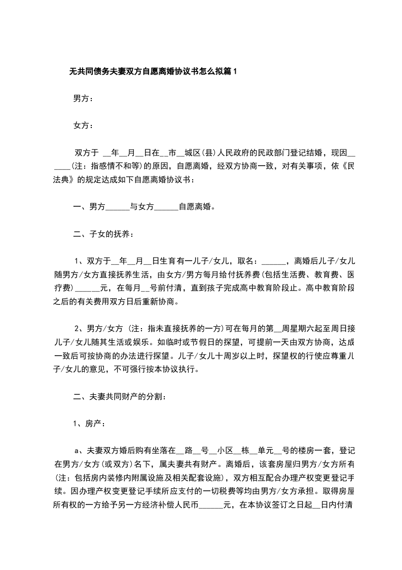 无共同债权夫妻双方自愿离婚协议篇1