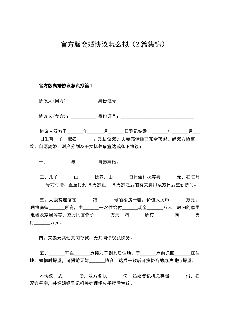 协议人双方于_______年_______月_______日登记结婚,_______年_______月_______日生育一子,取名_______。现协议双方夫妻感情确已完全破裂,经双方协商一致,自愿离婚、财产分割及子女抚养事宜达成如下协议: