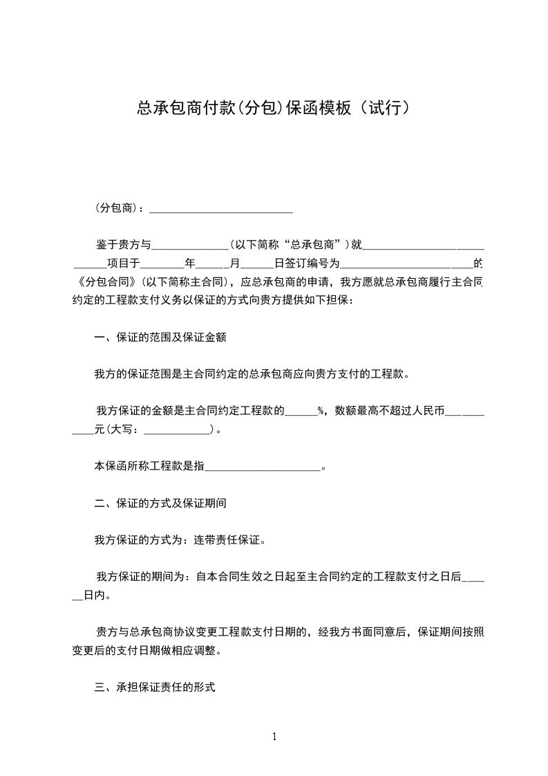 鉴于贵方与______________(以下简称“总承包商”)就____________________________项目于________年______月______日签订编号为________________________的《分包合同》(以下简称主合同),应总承包商的申请,我方愿就总承包商履行主合同约定的工程款支付义务以保证的方式向贵方提供如下担保: