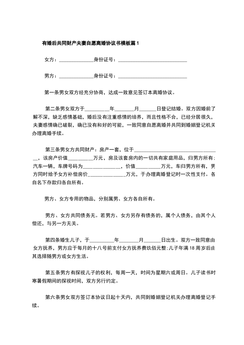 第一条:男女双方自愿离婚。基于不影响子女生活和学习的原则,双方本着相互体谅的态度,协助办理如下各项事宜。