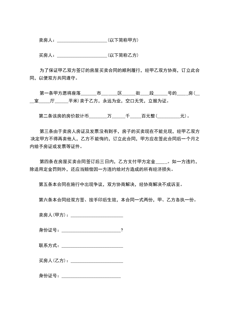 第三条由于卖房人房证及发票没有到手,房子的买卖现在不能兑现,经甲乙双方决定甲方不得再卖他人,乙方不能悔约,订立此合同,甲方应在签此合同后一个月之内给予房证或发票等证件。