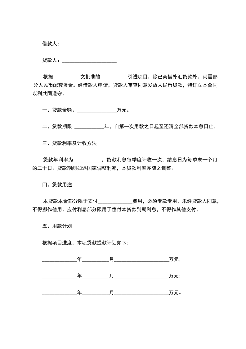 根据___________文批准的___________引进项目,除已商借外汇贷款外,尚需部分人民币配套资金。经借款人申请,贷款人审查同意发放人民币贷款,特订立本合同以利共同遵守。