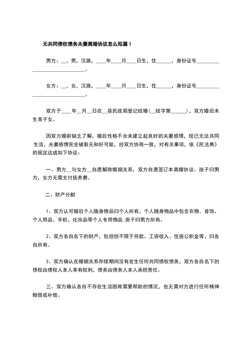 无共同的债务夫妻离婚协议篇1