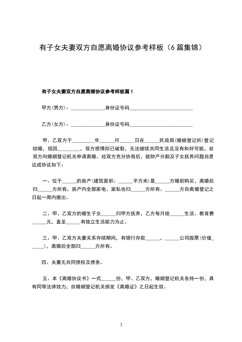 五、本《离婚协议书》一式______份,甲、乙双方,婚姻登记机关各持一份,具有同等法律效力,自婚姻登记机关颁发《离婚证》之日起生效。