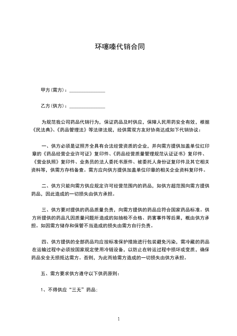 三、甲方向乙方提供书面代销、电话代销等代销方式。甲方在规定药品范围内供应的药品,其质量应保证符合国家法定标准和有关质量要求,提供的药品必须具有批准文号、注册商标、生产批号及有效期。药品的包装、标签、说明书应符合有关规定及要求。进口药品供加盖企业质管机构原印章的《进口药品注册证》和同批号《进口药品检验报告书》或通关单复印件。生物制品提供加盖企业质管机构原印章的《生物制品签发合格证书》复印件,甲方因违反上述条款,引起质量纠纷,甲方应承担相应经济和法律责任。