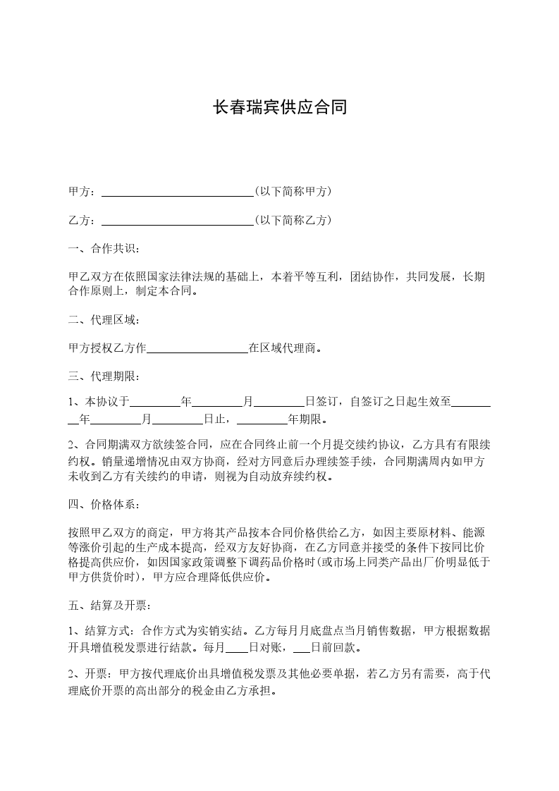 3、甲方向乙方供货为底价供货,乙方向外供货价不得低于____扣,零售价不低于元/盒。若因促销等特殊原因需调整价格,必须提前书面呈报甲方同意,否则视为违约,甲方有权取消对其奖励,情节严重者,甲方有权取消其代理资格。