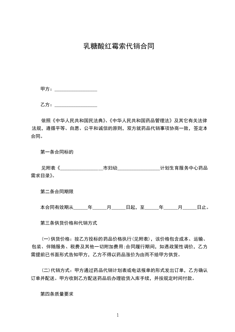 依照《中华人民共和国民法典》、《中华人民共和国药品管理法》及其它有关法律法规,遵循平等、自愿、公平和诚信的原则,双方就药品代销事项协商一致,签定本合同。