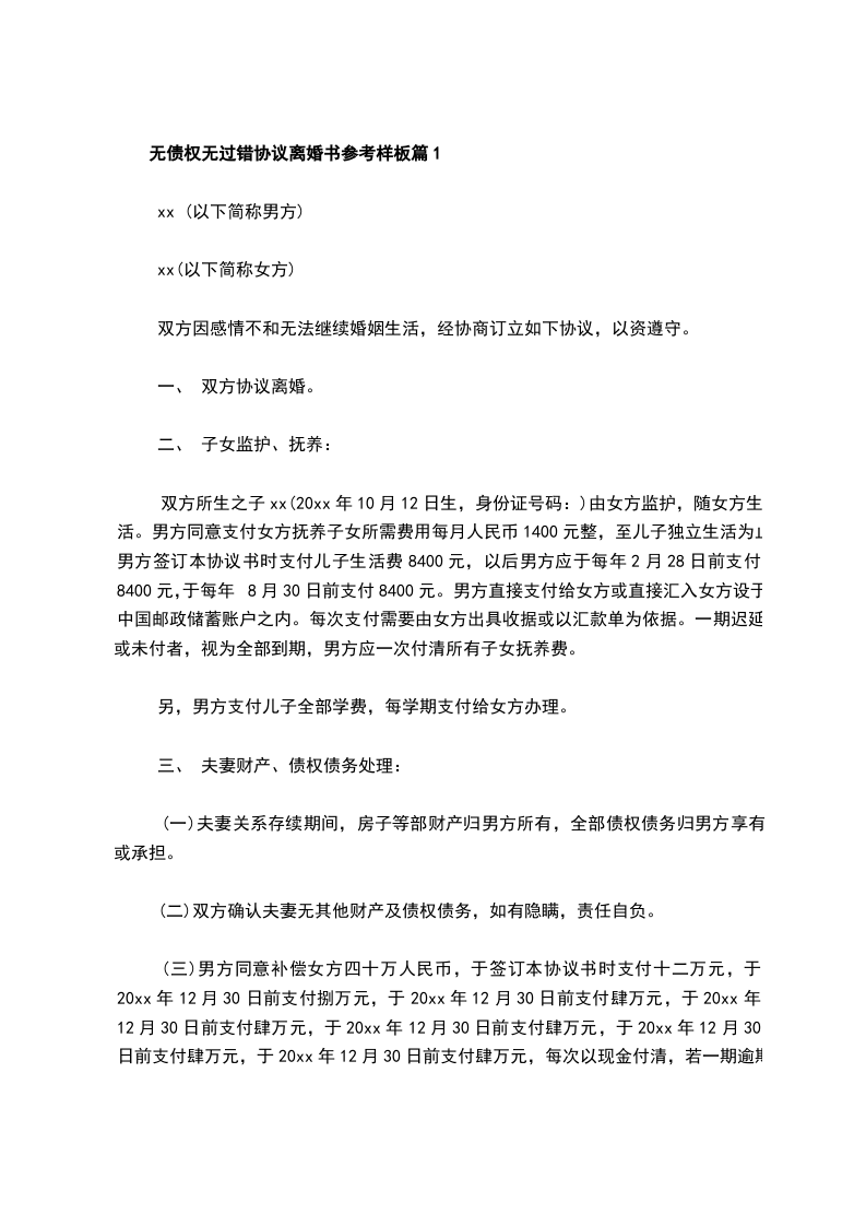 无债权无过错协议离婚书参考样板篇2