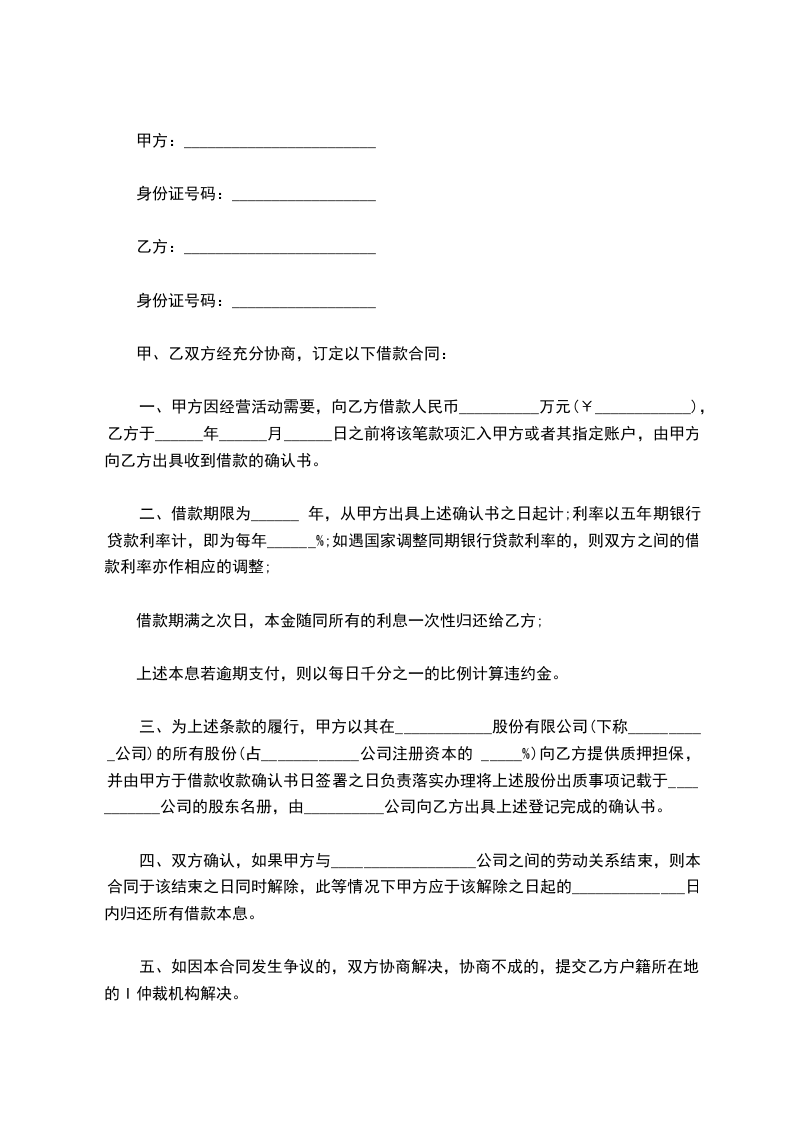 四、双方确认,如果甲方与__________________公司之间的劳动关系结束,则本合同于该结束之日同时解除,此等情况下甲方应于该解除之日起的______________日内归还所有借款本息。