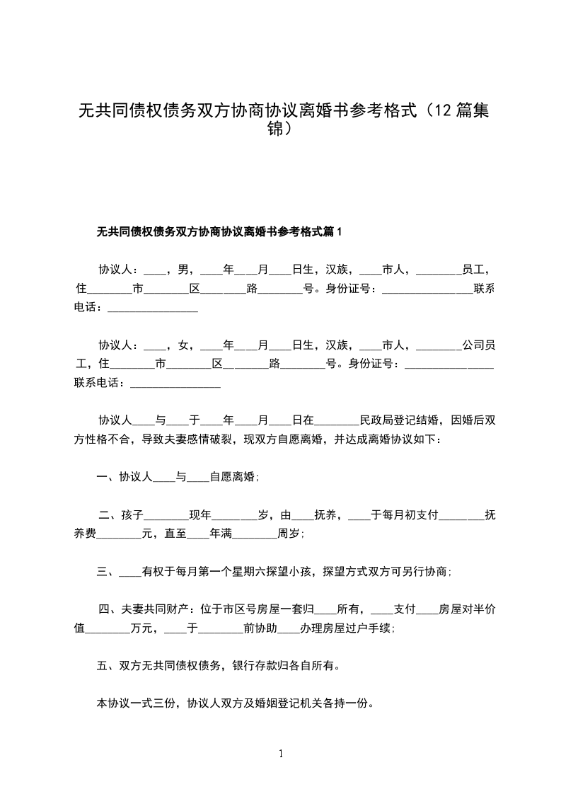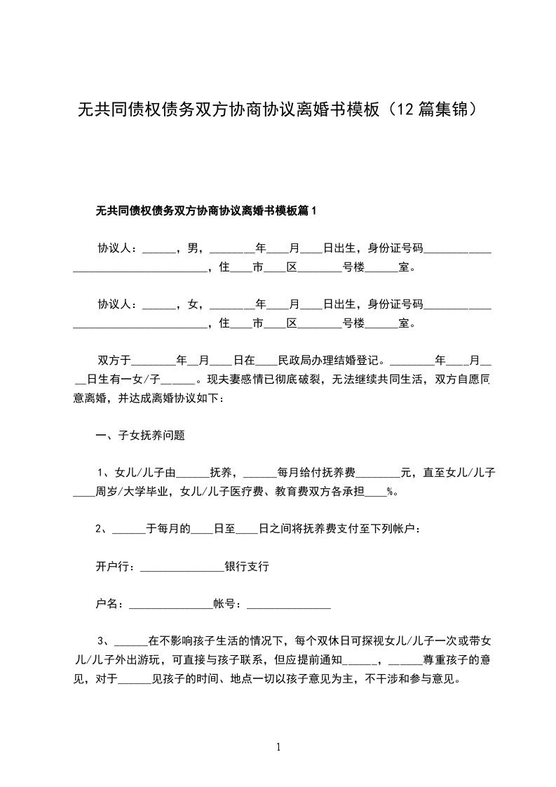 双方确认在婚姻关系存续期间没有发生任何共同债务,任何一方如对外负有债务的,由负债方自行承担。任何一方隐瞒债务,导致另一方承担责任的。另一方除可以向隐瞒债务的一方全额追偿外,还可以按照被隐瞒债务总额的30%要求其承担违约责任。
