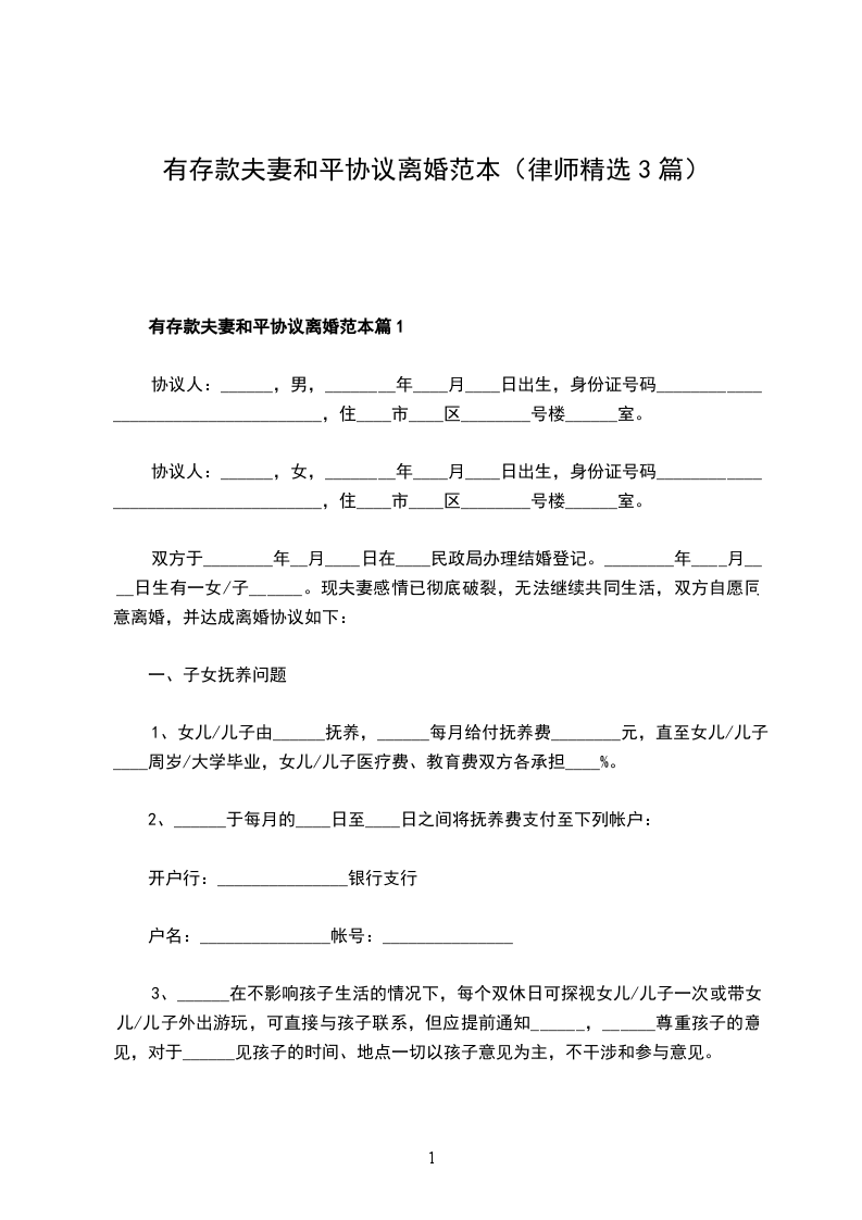 有存款夫妻和平协议离婚范本样本篇3