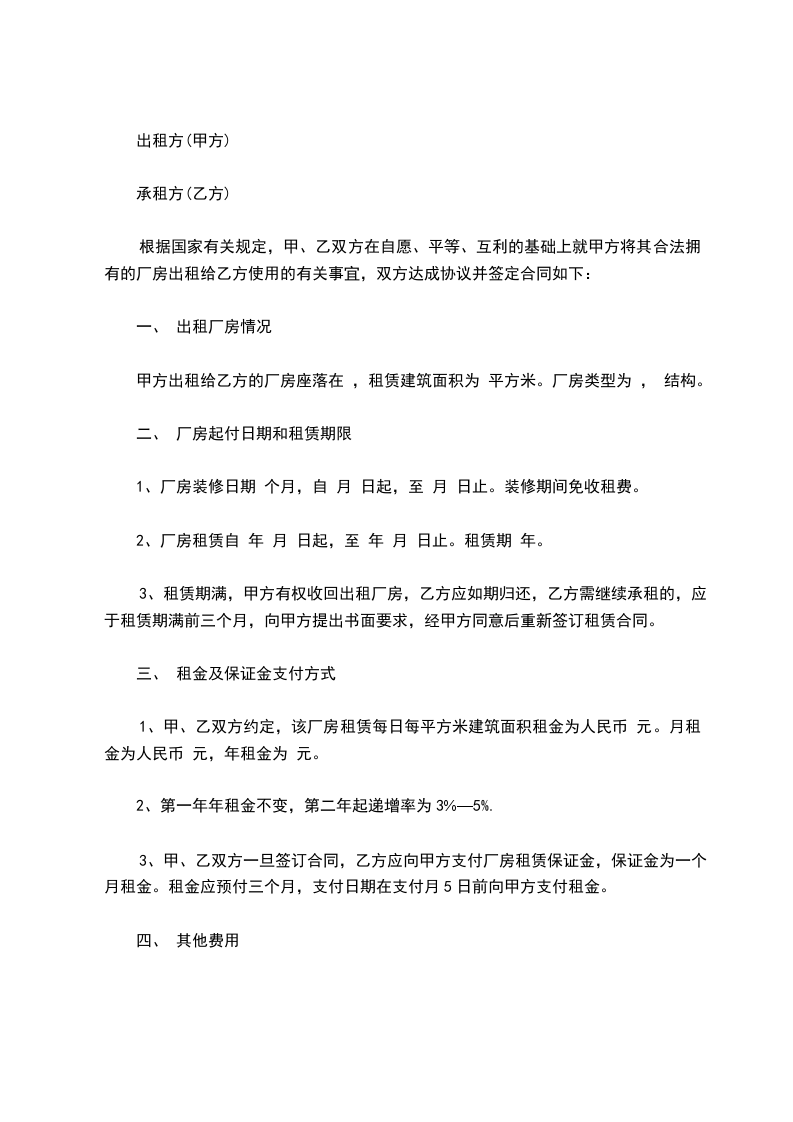 1、甲、乙双方约定,该厂房租赁每日每平方米建筑面积租金为人民币_____元。月租金为人民币_____元,年租金为_____元。