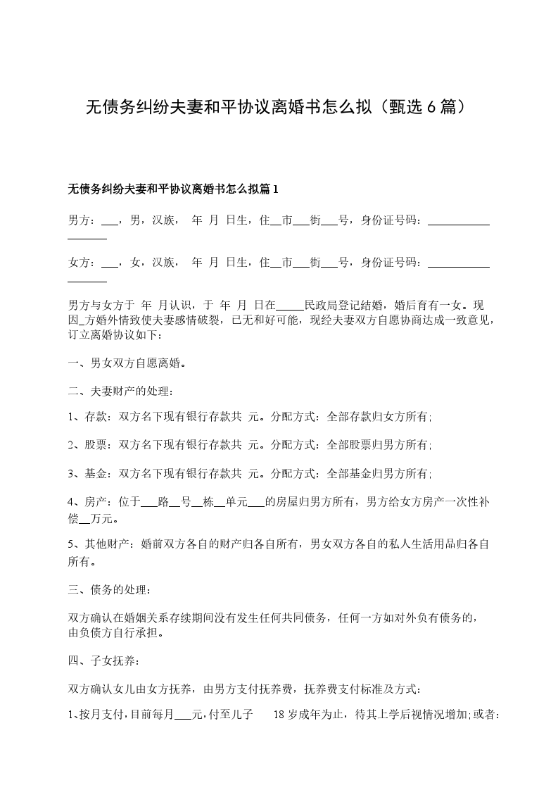 男方与女方于______年____月相识,并于______年____月____日在_________民政局登记结婚,婚后于______年____月____日生育一儿子,名_________。因____________________________致使夫妻双方感情破裂,且已无任何和好可能,现经双方自愿协商达成一致意见,订立离婚协议如下: