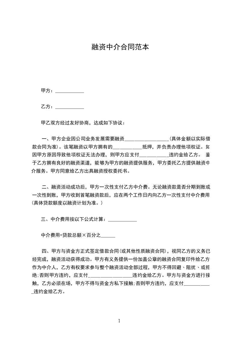 四、甲方与资金方正式签定借款合同(或其他性质融资合同),视同乙方的义务已经完成,融资活动获得成功。甲方有义务提供一份加盖公章的融资合同复印件给乙方。作为中介人,乙方有权要求参与整个融资活动全部过程,甲方不得回避﹑阻扰﹑或拒绝;否则甲方违约,应支付__________________违约金给乙方。甲方与资金方进行接触,乙方必须在场,甲方不得与资金方私下接触;否则甲方违约,应支付____________违约金给乙方。