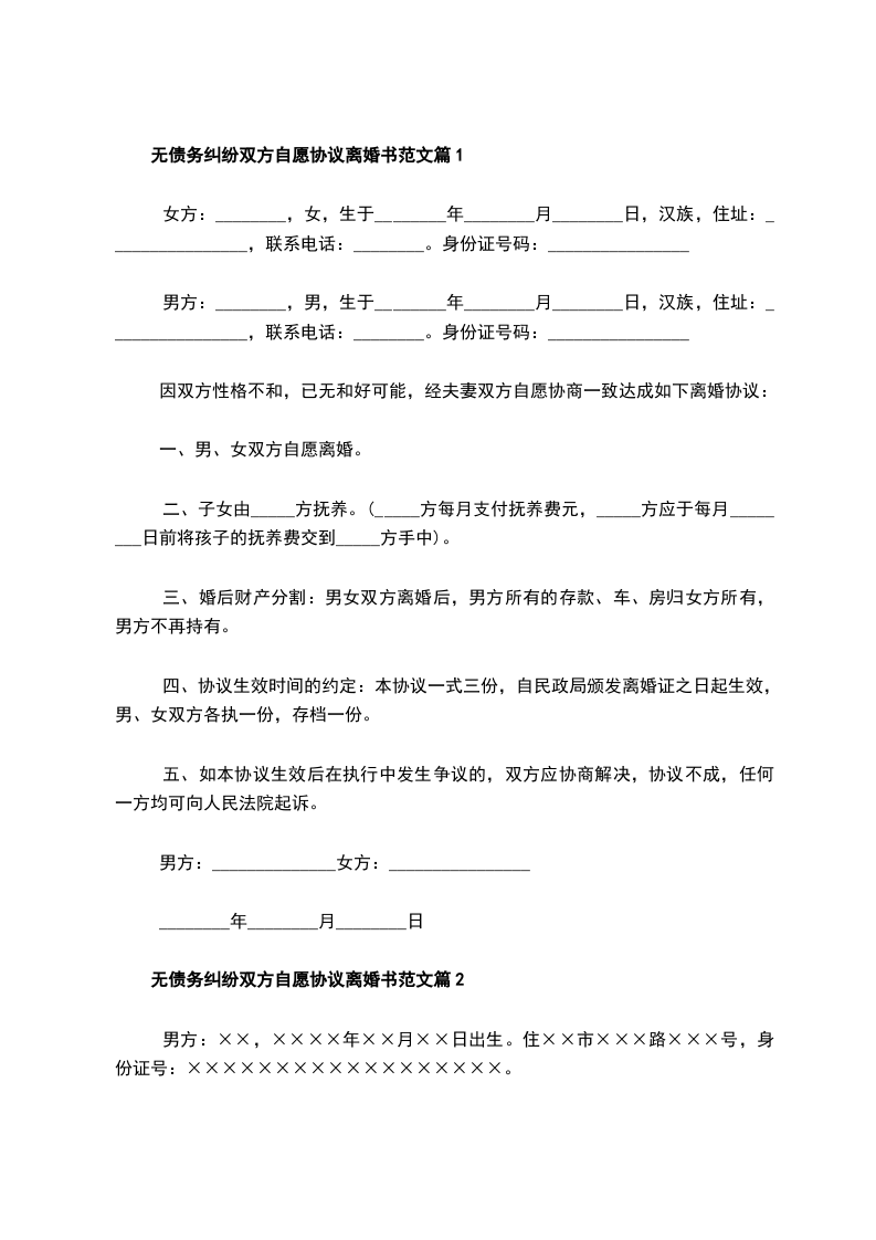 无债务纠纷双方自愿协议离婚书参考样板篇2