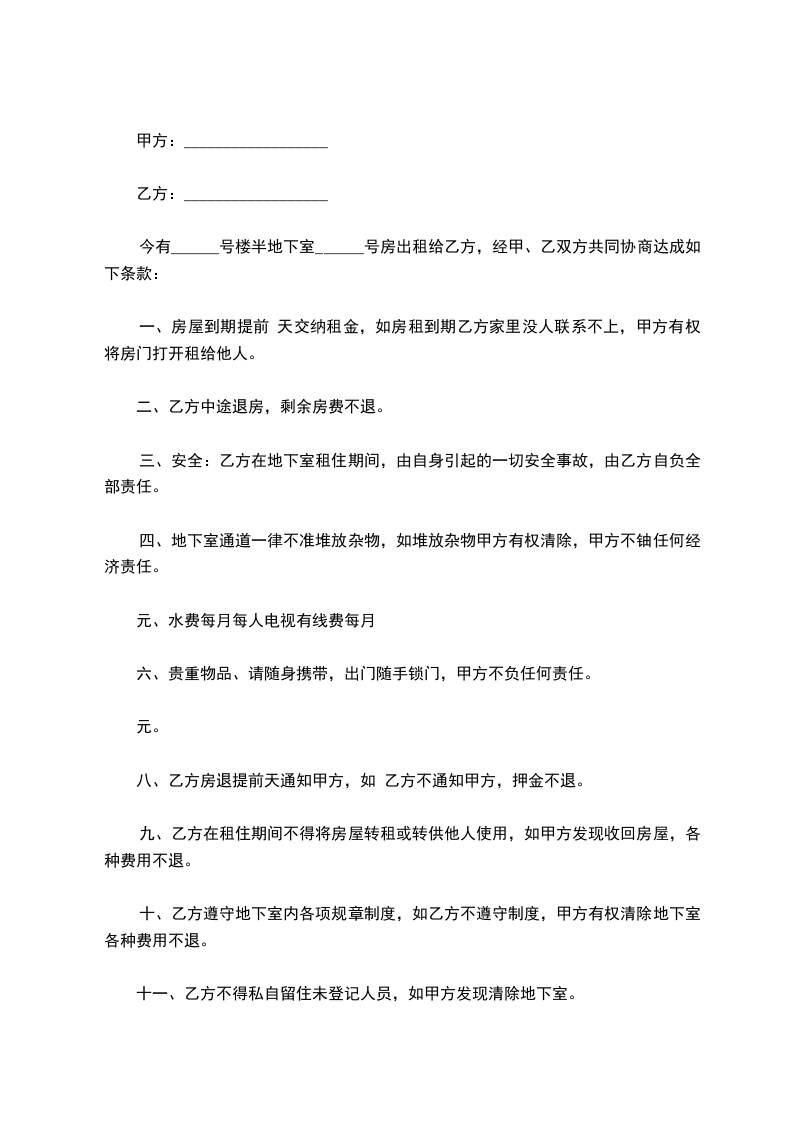 十一、乙方不得私自留住未登记人员,如甲方发现清除地下室。